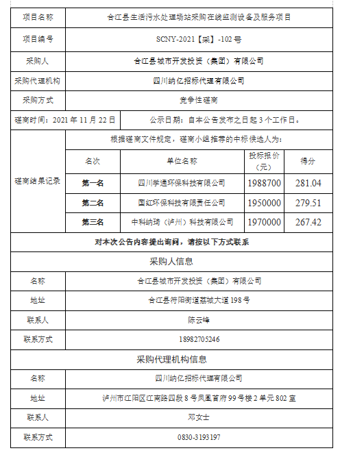 合江縣生活污水處理場(chǎng)站采購(gòu)在線監(jiān)測(cè)設(shè)備及服務(wù)項(xiàng)目競(jìng)爭(zhēng)性磋商結(jié)果公告