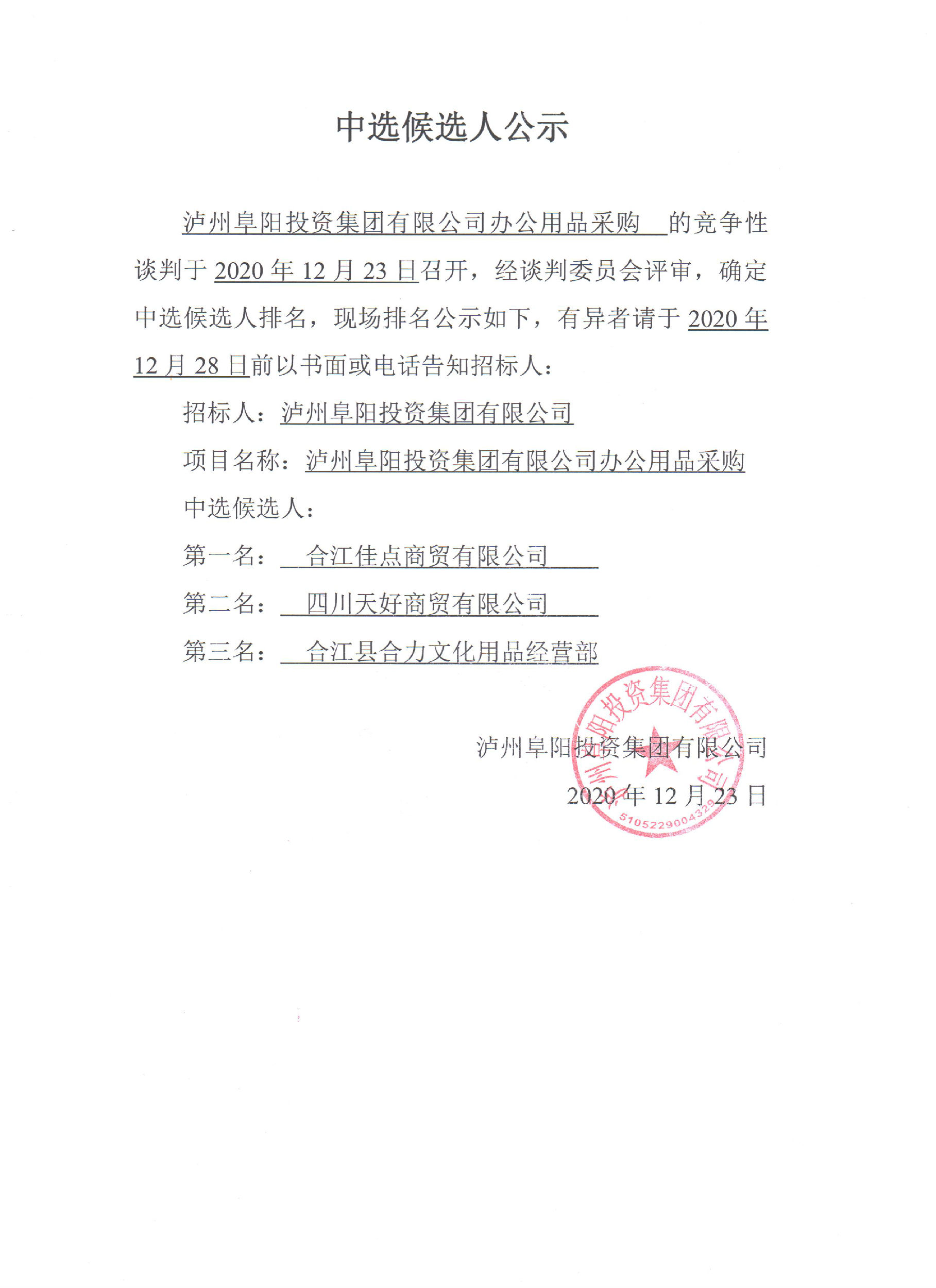 瀘州阜陽投資集團(tuán)有限公司辦公用品采購中選候選人公示