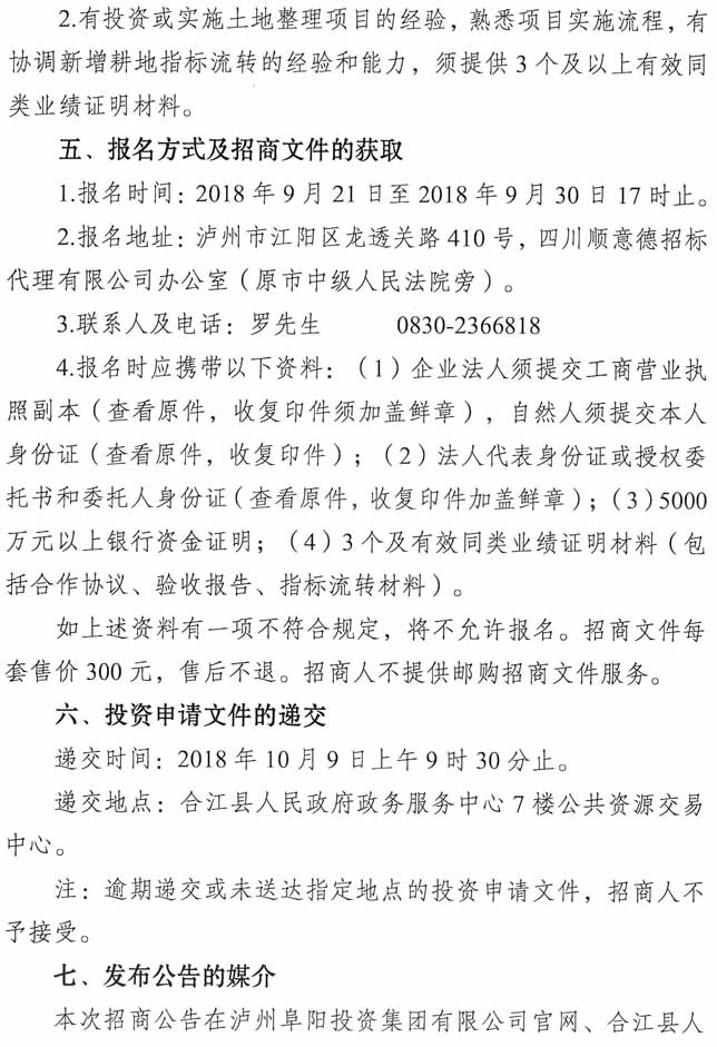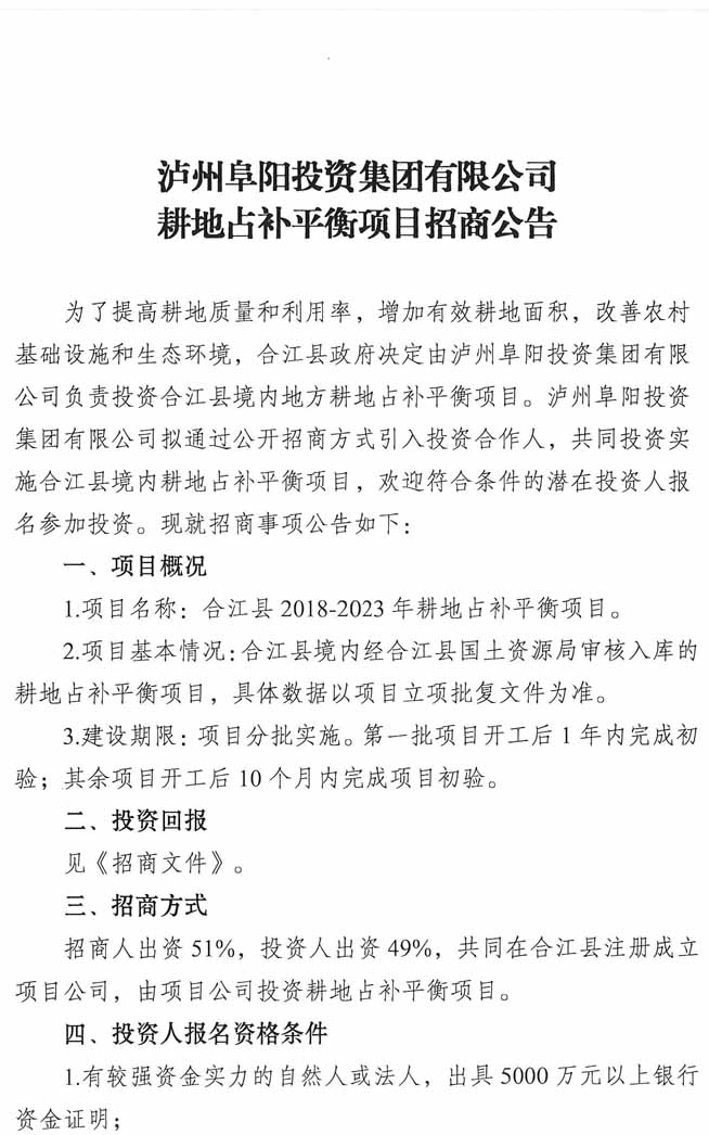 招商公告:瀘州阜陽投資集團有限公司耕地占補平衡項目招商公告