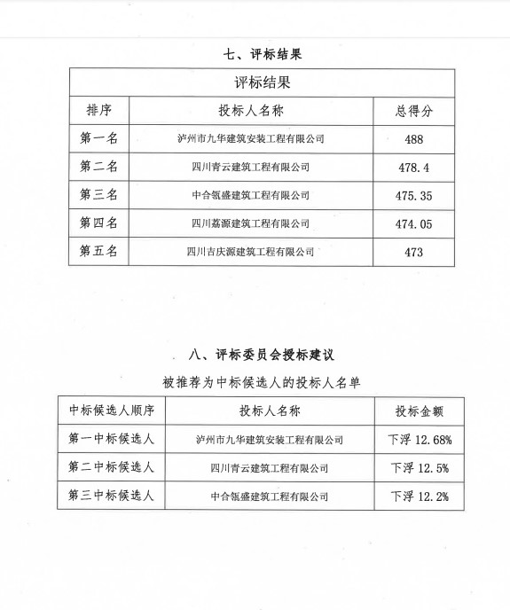 中選單位為:瀘州市九華建筑安裝工程有限公司,中選金額為:以財(cái)評(píng)總價(jià)下浮12.68%。