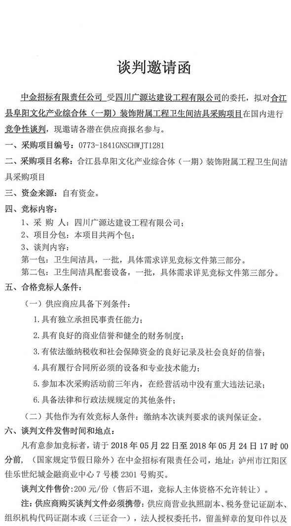 談判邀請(qǐng)函:合江縣阜陽文化產(chǎn)業(yè)綜合體(一期)裝飾附屬工程衛(wèi)生間潔具采購項(xiàng)目