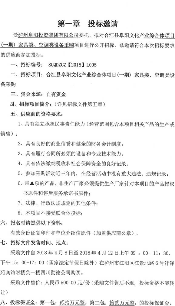 投標(biāo)邀請(qǐng):合江縣阜陽(yáng)文化產(chǎn)業(yè)綜合體(一期)項(xiàng)目家具類、空調(diào)類設(shè)備采購(gòu)
